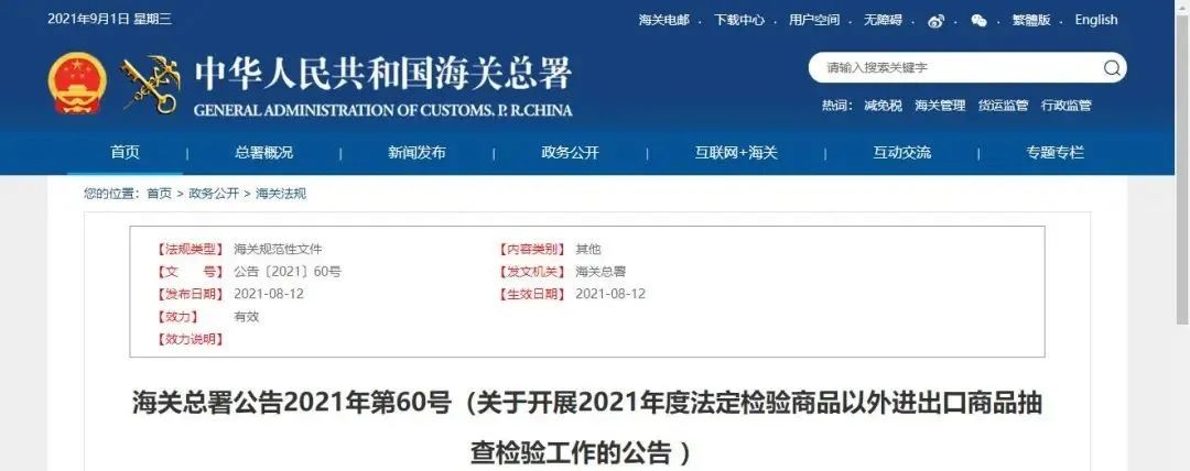 8月12日,海關(guān)總署發(fā)布2021年第60號(hào)公告,決定對(duì)2021年法定檢驗(yàn)商品以外的部分進(jìn)出口商品實(shí)施抽查檢驗(yàn),抽查檢驗(yàn)的商品范圍涉及20類進(jìn)出口商品,其中進(jìn)口商品13類,出口商品7類。