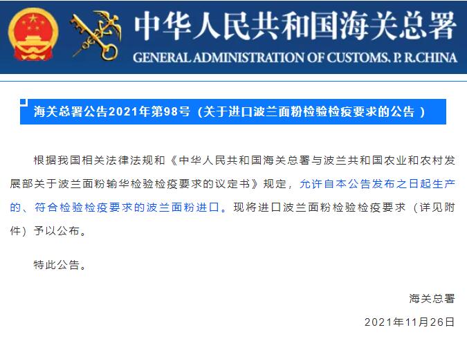 2021年11月26日,海關(guān)總署公布2021年第98號(hào)公告:允許自本公告發(fā)布之日起生產(chǎn)的、符合檢驗(yàn)檢疫要求的波蘭面粉進(jìn)口。