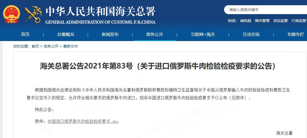 2021年10月18日,海關(guān)總署發(fā)布2021年第83號(hào)公告:允許符合相關(guān)要求的俄羅斯牛肉進(jìn)口,詳情如下: