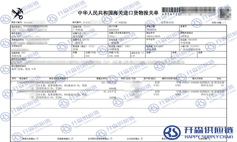 【本文結(jié)語】 上述就是美國DHA藻油進口報關(guān)代理服務(wù)【經(jīng)典案例】的全部內(nèi)容,希望能對您有所幫助,如有食品進口報關(guān)上任何疑問及問題可隨時在線聯(lián)系我們或撥打 18002611553,開森供應(yīng)鏈擁有豐富的食品進口報關(guān)操作經(jīng)驗及案例,10余年進口經(jīng)驗為您所用,各類進口疑難都能為您一一解答及協(xié)助快速處理解決!